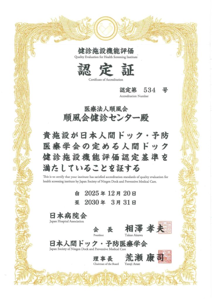 この度、公益社団法人日本人間ドック・予防医療学会による「人間ドック健診施設機能評価」を受審し、学会が定める審査基準を満たしているとして、新規で認定を取得しました。